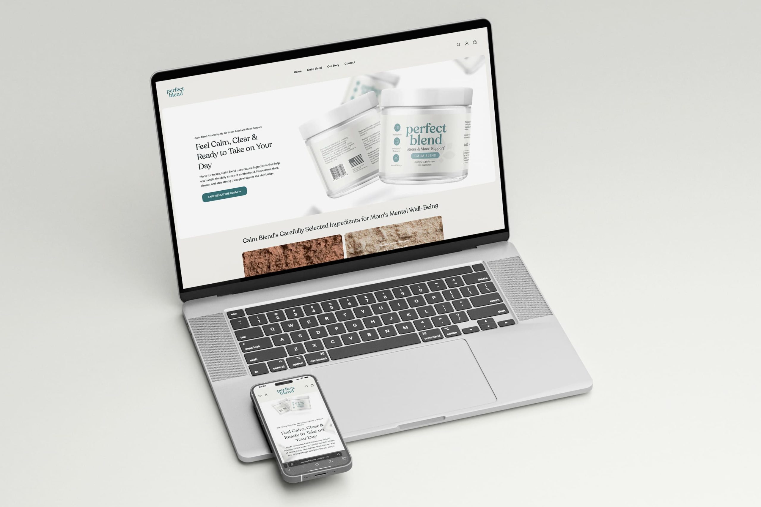 Perfect Blend is a wellness brand built specifically for parents—those managing the beautiful chaos of daily life. With a science-backed, calming supplement at its core, the brand speaks to clarity, emotional balance, and energy without overwhelm. We created a visual identity that feels clean, supportive, and approachable—just like the product itself.